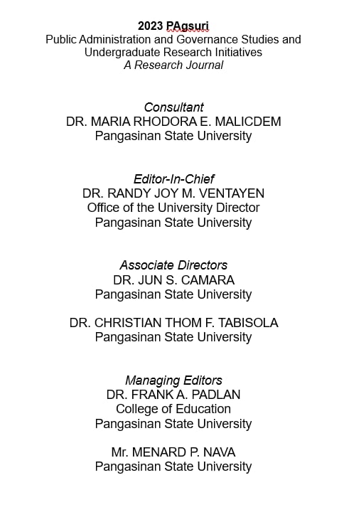 Public Administration and Governance Studies and Undergraduate Research Initiatives or PAgsuri is dedicated to the compilation of researches in the field of Public Administration, which aims to contribute to the advancement of knowledge and to the government. This collection of study represents the collaboration efforts of researchers who are committed to continues to evolve in response to emerging social, political, and economic, generating innovative ideas and solutions, and applying rigorous methodologies in their respective domains.